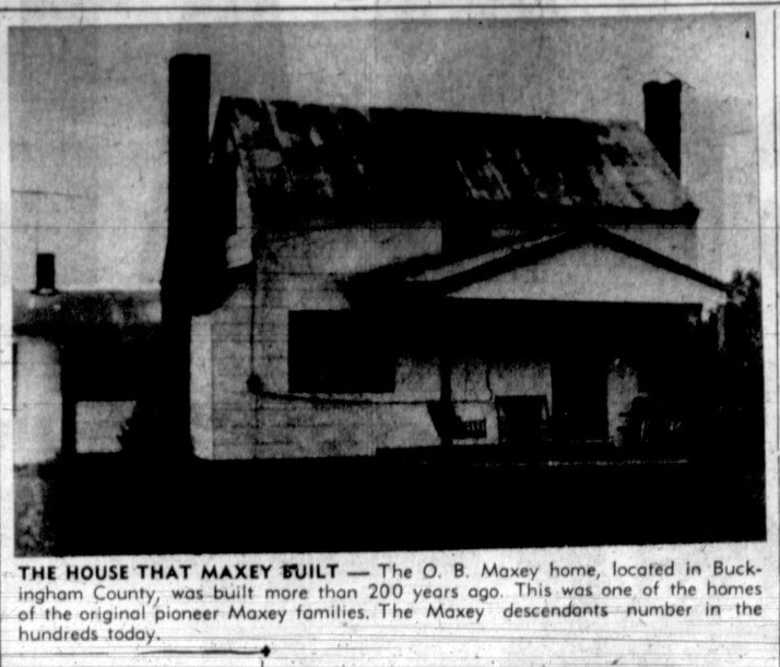 One of the early homes of the Maxey family is the home of O. B. Maxey in Buckingham. Another is in Powhatan County.
