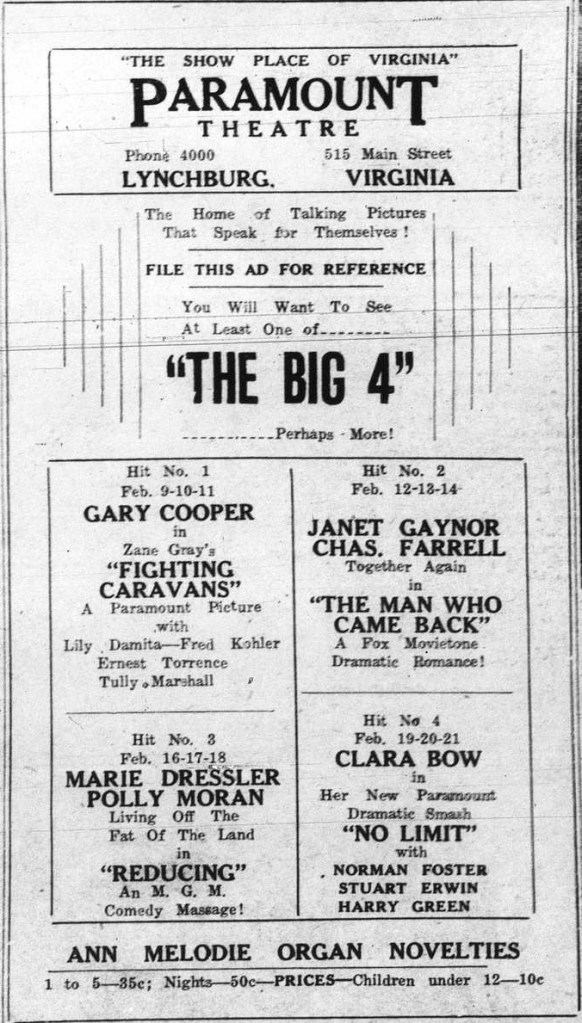 Published in Dillwyn, in 1931 a year’s subscription cost $1.00. L. H. Shrader was Publisher and Editor. Julien Dwight Martin served as Editor and Business Manager. Emma J. Ragland contributed as Local Editor and Solicitor. News items covered Cumberland County as well as Buckingham. Advertisers represented businesses as far away as Amherst County and Lynchburg, including the Paramount Theater advertised as “The Show Place of Virginia.”