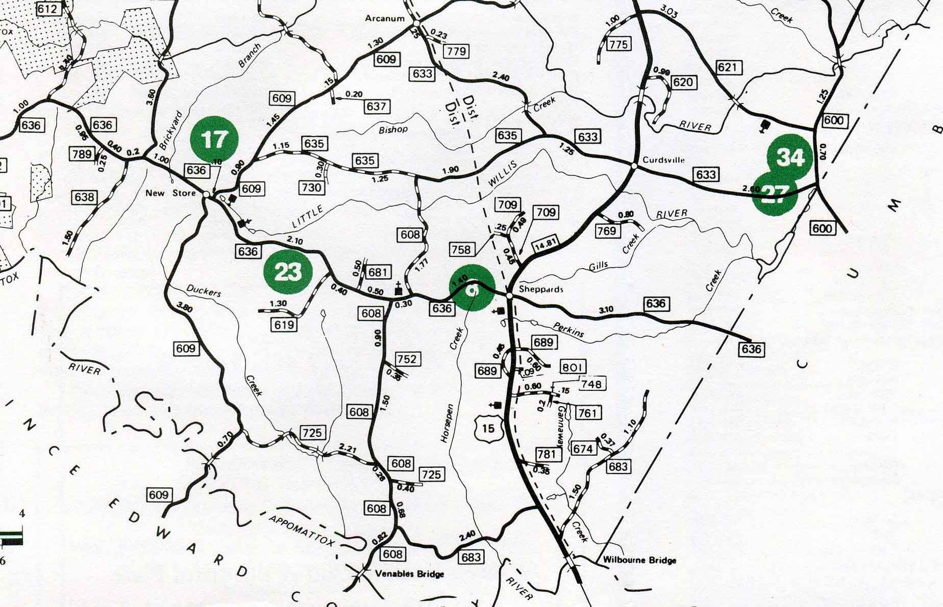 This detail includes Sheppards, Curdsville, and New Store. All will be mentioned in future posts. This is the territory of Revolutionary War hero, Peter Francisco, and the once thriving resort, Buckingham Springs.