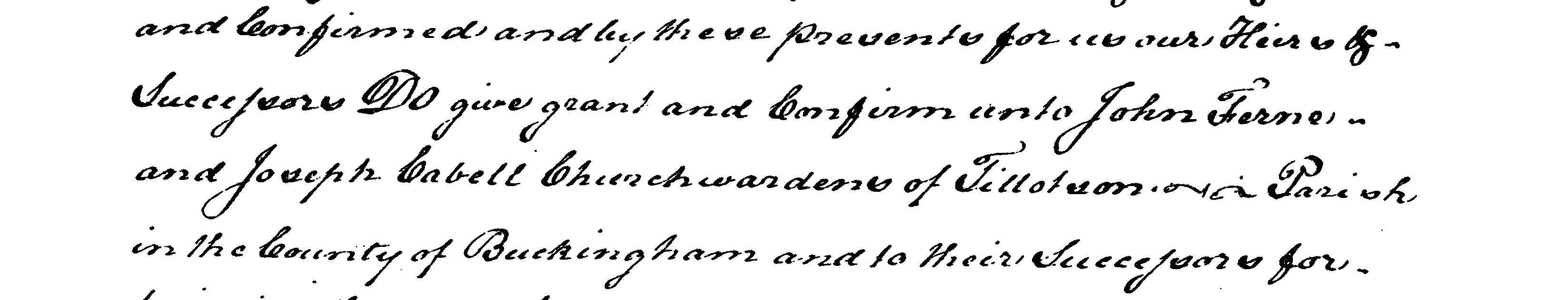 In the autumn of 1767, six years after Buckingham County was created, Churchwardens John Ferne (a.k.a. Fearn) and Joseph Cabell were granted land on which to build a church. Royal Governor Francis Fauquier signed the land grant. It read in part, “We have given granted and confirmed and by these presents for us our Heirs & Successors Do give grant and confirm unto John Ferne and Joseph Cabell Churchwardens of Tillotson Parish in the County of Buckingham and to their successors for building thereon a Chapel. . . one acre and an half.”