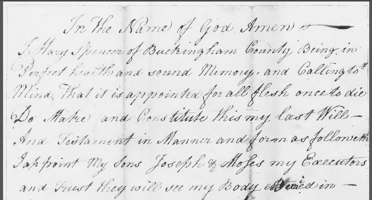 Coz. Harry reports that he hit Buckingham gold yesterday when he followed the Library of Virginia’s link to the digital collection of “Lost Records.” The result was a new Buckingham ancestor, Mary Spencer (d. 1783), mother of Moses Spencer (d. 1829). Congratulations! Above is the opening of her last will.