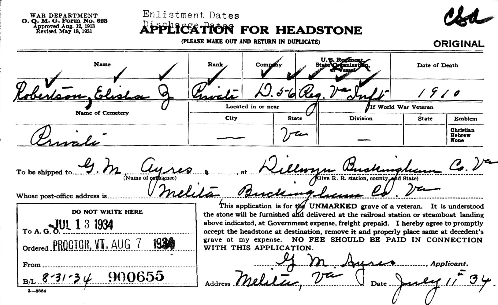 Below is a sample application for Elisha Z. Robertson of Buckingham County. The record includes basic information about his military service as well as the year of his death and the name of person who applied for the headstone. In this case, the applicant was G.M. Ayres.
