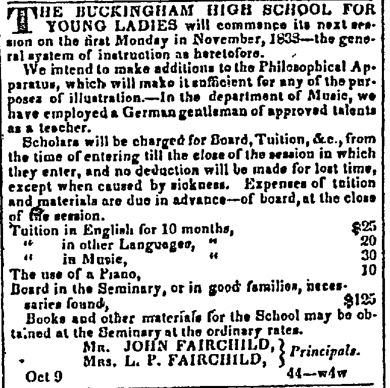 In addition to the regular school term, the Fairchilds offered summer sessions as indicated by this advertisement from May of 1840: