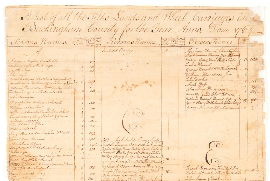 Now, in addition to finding various Buckingham County wills digitalized at the Library of Virginia’s “Lost Records Localities Digital Collection,” anyone can access images of the original Buckingham County Tithable List, A-G, 1764.