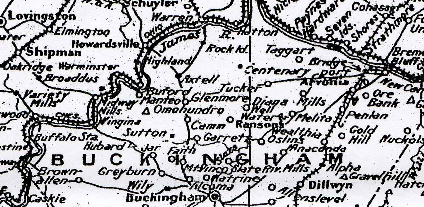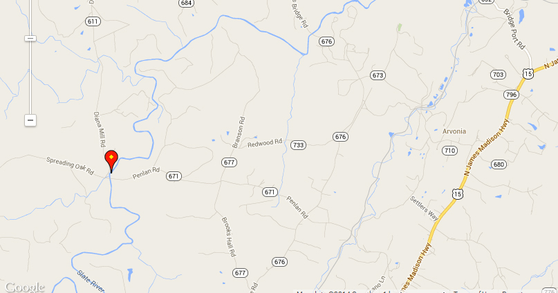Its ruins can still be found in Buckingham County on the Slate River, west and a bit south of Arvonia, near the crossroads of today’s Diana Mills Road and Spreading Oaks Road. The red pin on the map below marks the spot.