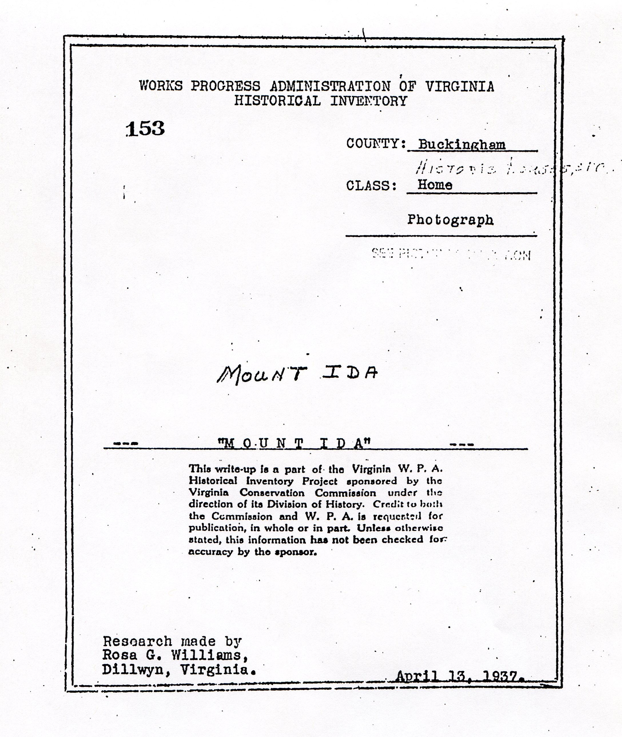 In 1937, Garnett Williams surveyed Mount Ida for the Virginia Historical Inventory. The burning of Buckingham Courthouse in 1869 made a typical deed search impossible. She began with William Leitch, unaware of previous owners.