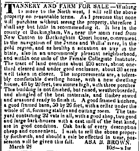 TANNERY AND FARM FOR SALE – Wishing to move to the Northwest, I will sell the above property on reasonable terms. As I presume that none will purchase without seeing the property, therefore I shall say but little in recommending it. It lies in the county of Buckingham, Va, near the main road from New Canton to Buckingham Courthouse, convenient to the navigation of the James and Willis’ river, in the gold region, and as healthy a situation as any in the State, also in an uncommonly pleasant neighborhood, and within one mile of the Female Collegiate Institute. The tract of land contains about 250 acres, about one-third cleared and under good enclosure, about 20 acres well taken in clover. The improvements are, a tolerably comfortable dwelling house, with a new dwelling house, 40 by 20 feet, two stories high, with three porches. This building is not finished, but raised, weatherboarded, and shingled of the best materials, and timber sawed and seasoned ready to finish it. A good framed kitchen, a good framed barn, 50 by 26 feet, with a cellar under the whole of it, forming stables and cutting room. The tanyard containing 32 vats in all, with a good shop, two good and large bark-houses with a cast mill of the best kind, are in good condition. Oak bark of every description cheap and convenient. I wish to sell the above property forthwith, and should a sale be effected in time, possession will be given this fall.