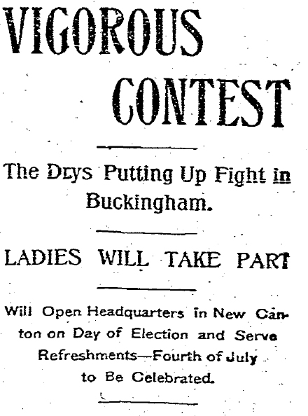 On election day the young ladies of Arvonia, belonging principally to the Presbyterian and Baptist churches, will go to New Canton, the voting precinct, in a body, floating a banner and wearing streamer anti-saloon badges. They have secured a house and ground on the principal street in New Canton, and will there serve refreshments, such as ice cream, fruits, coffee, etc. to the friends of the temperance movement. It is understood that the ladies at Gold Hill, the other voting precinct, will proceed along similar lines.