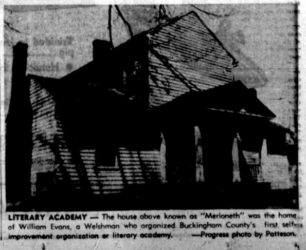 The first benefit was from the Buckingham Literary Academy, the first of the cultural organizations in the county, which was conceived and set in motion at Merioneth by William Evans, a Welshman.