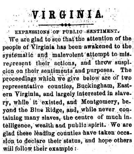 On August 22, 1865, a revealing article was printed in Richmond’s Whig entitled, “Virginia. Expressions Of Public Sentiment.” Dr. Davidson, chaired the committee, expressing fidelity to the Federal Government. Buckingham County’s statement read as follows: