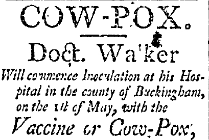 In 2017, a post at Slate River Ramblings featured an advertisement by a Dr. Walker who was offering inoculations against smallpox in Buckingham County. Click here to read the advertisement: Buckingham County: Cow-Pox.