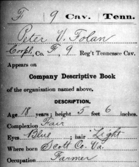 He joined Company F of the 9th Regiment of the Tennessee Cavalry and, a month later, appeared on the October 15, 1863 muster at Knoxville. By November, something was amiss. On November 15, the record shows that Peter Foland had deserted his company, which remained in Knoxville. No other details were given. Apparently, either this was erroneous or something unstated in the record had affected Peter’s presence in his company. Over twenty years later, on July 8, 1885, this charge was removed from his war record, documented in a notation from the War Department: “The charge of desertion of November 5 (or 15) 1863 against this man is removed.” Again, no further details were given.