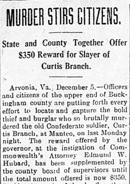 Richmond’s Times-Dispatch followed printed a new report in its December 4, 1911 issue, announcing that there was a reward of $350 for information about the slayer of Curtis Branch. This article indicated that not only was Buckingham County’s Commonweath’s Attorney Edmund W. Hubard involved in the case but also that the US government had sent a detective to investigate because the looting of the post office included the theft of postal funds and stamps.
