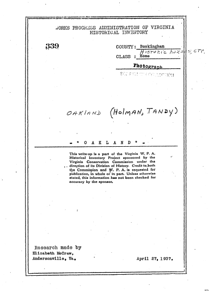 In 1937, Elizabeth McCraw surveyed the Holman dwelling house at “Oakland” for the Virginia Historical Inventory. She described its location as “.8 mile west of Andersonville, Va., on Route #640; thence north on Route #642 2.9 miles. East side of the highway.” She went on to note that Tandy Holman was the owner in 1832, followed by Mrs. Mary L. Jones (1877), and M. T. Jones (1899, present owner in 1937).