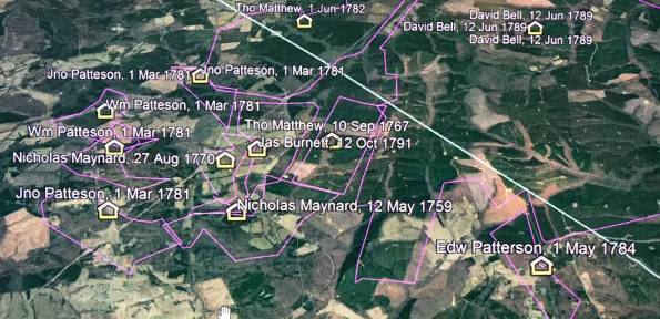 An index for mapping software contains several entries for John Patteson beginning in 1746. Results show that Patteson’s land was scattered, though some of it lay near Nicholas Maynard’s property. We know that Patteson acted as Reader & Sexton at Maynards Church but the location of his residence remains unclear. By 1793, Patteson was deceased.
