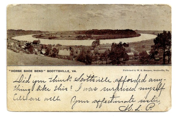 Going through my files, I found a photocopy of this charming post card from M. L. P. to Mr. Thomas E. Patteson in Maryland. The view is from Scottsville, Virginia looking across the Horseshoe Bend of the James River. The land at the tip of Buckingham County was once Snowden, Randolph Jefferson’s plantation.