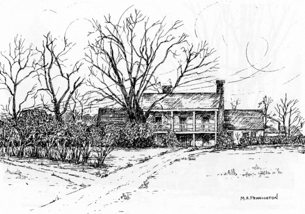 “Travelers Rest” was built with hand-wrought nails, and the brick was made on the place. There were only four rooms in the original house with a very wide hallway. The original house was of brick, but about 1850 it was weatherboarded over and more rooms added. The sills of the house are of hardwood and are very large. It seems when they added rooms they also added porches. The front porch is in three sections, where it has been added to from time to time.
