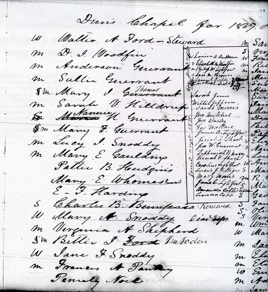 Included in the record book is a list of members at Dunn’s Chapel for 1869 and 1870, beginning with Walter A. Ford, Steward. Many familiar families from northern Buckingham worshipped there, such as Allen, Guerrant, Lightfoot, Maxey, and Norvil (sic), Oslin, and Snoddy. Notations mention individuals who had withdrawn or had been removed, including my relations James W. Allen and Margaret E. Allen.